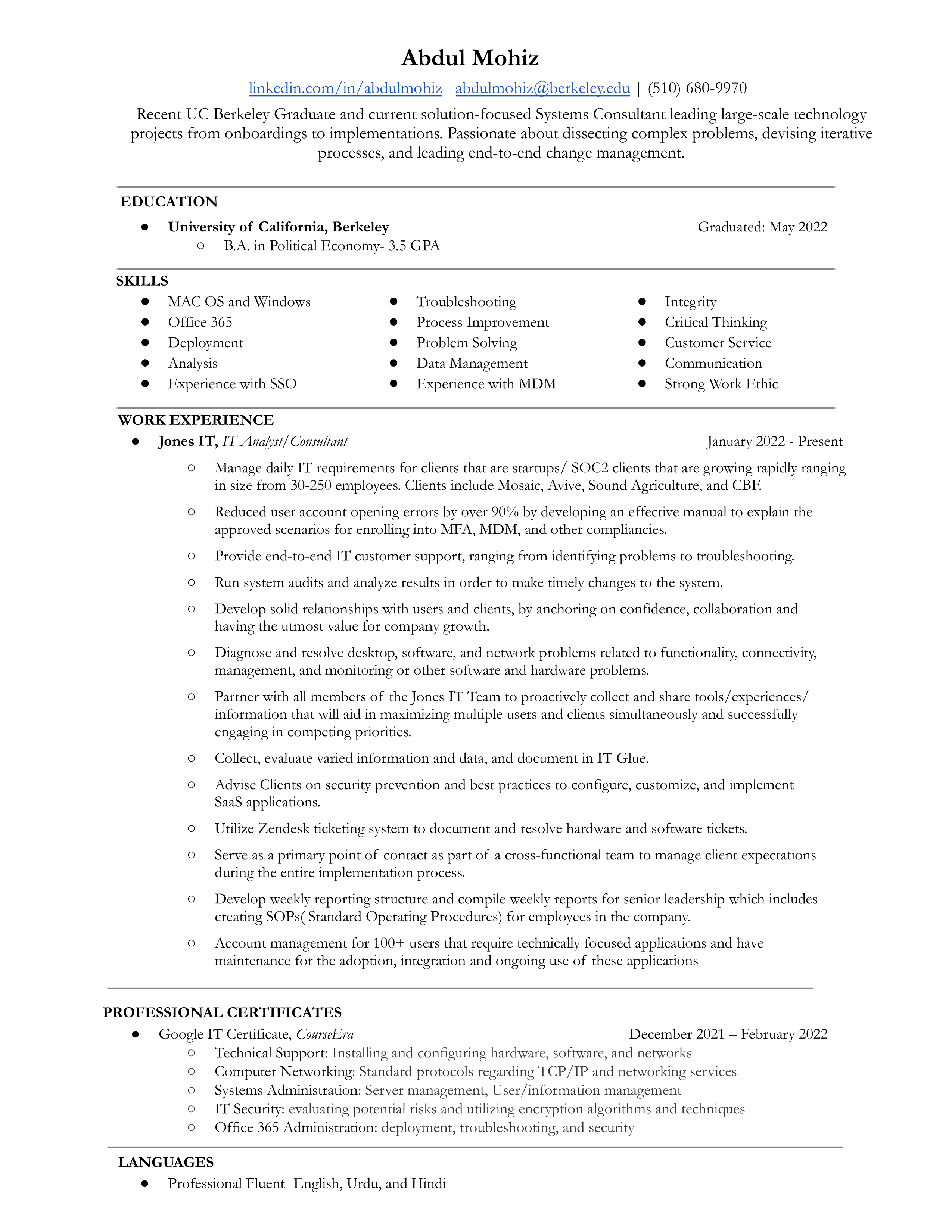 π My first full-time job was at JonesIT (https://www.itjones.com) during my final semester at Cal. I am currently employed there as an IT Consultant. In my spare time, I enjoy learning Python and hope to attain new skills that will help me advance in the corporate world